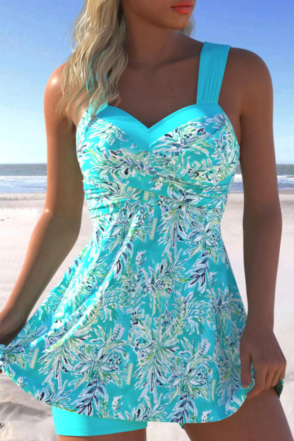 Surplice Cyan Leaf Print Swimdress and Shorts