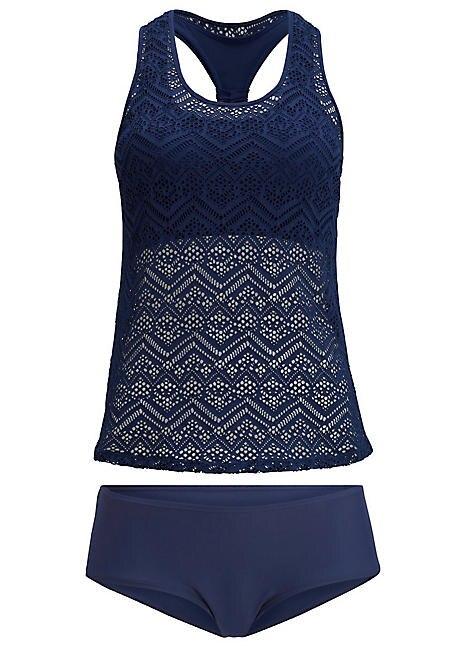 A racer back tankini top with a crochet lace shell and padded cups. Matching bottoms included.